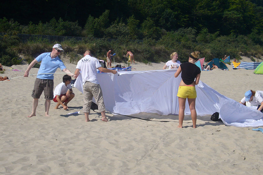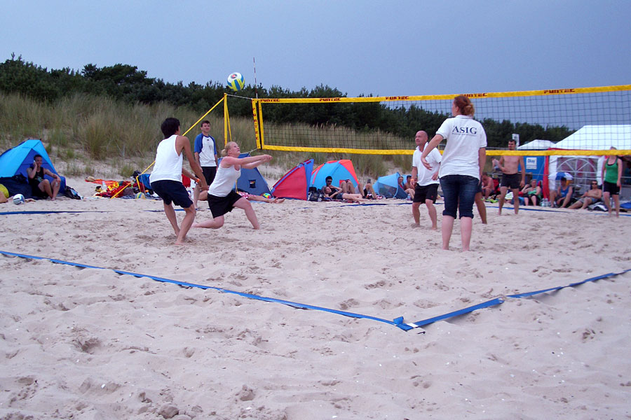 Bei der erstmaligen Teilnahme an diesem Sportevent stand für die ASIG-Azubis aber zuallererst der Spass und die olympische Maxime "Dabbeisein ist alles" im Vordergrund. Dennoch war nach den ausgiebigen Trainingseinheiten auch der Ergeiz geweckt und man wollte eine möglichst gute Figur auf den Strandplätzen abgeben. Dafür wurden dann auch alle Register gezogen. Schon zwei Tage vor Turnierbeginn reiste das Team an, um sich mit den Gegebenheiten vor Ort vertraut zu machen. Der folgende Tag wurd dann ganz professionell zum akklimatisieren am Strand genutzt (siehe Fotos).